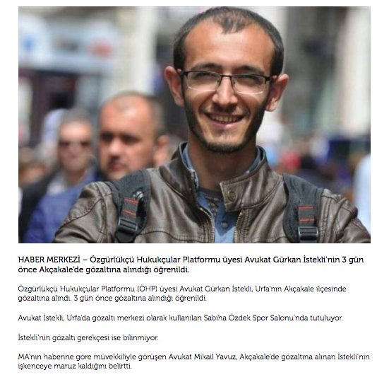 Lawyer Gürkan İstekli who is the member of @ohplatformu has been under police custody in Sanliurfa for 3 days. Lawyer Mikail Yavuz said after interviewed with him in custody centre that He (Gurkan Istekli) was subjected torture and ill-treatment.pic.twitter.com/4MJTZc4UjQ