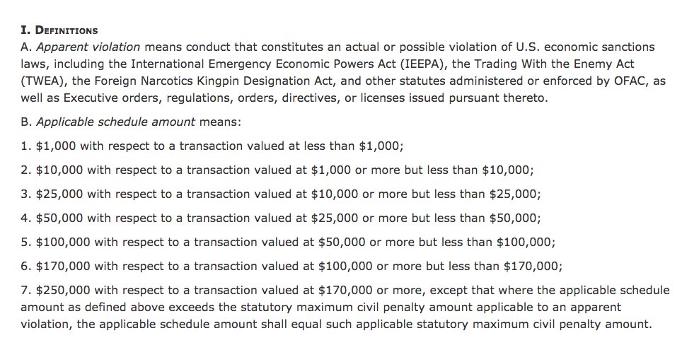 31 CFR Appendix A to Part 501, Economic Sanctions Enforcement Guidelines. OFAC tarafından Bankalara ceza verilmesi durumunda uygulanacak yasa. Her bir işlem için ayrı ceza..pic.twitter.com/BMlQb7EIV5
