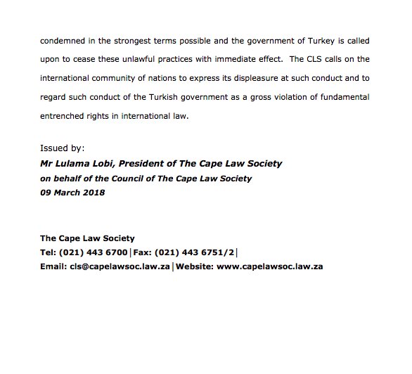 South Africa Bar Assoc, The Cape Law Society denounced mass arrests of Turkish lawyers & judges, and urged int'l community of nations to express its displeasure at gross violation of fundamental rights and int'l law.pic.twitter.com/ygft0SGzfz