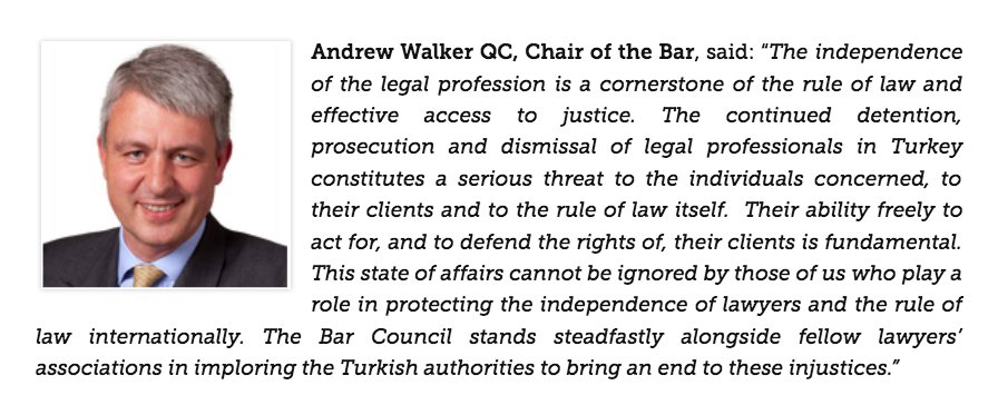 Chair of @thebarcouncil, Mr Andrew Walker QC: The continued detention, prosecution and dismissal of legal professionals in Turkey constitutes a serious threat to the individuals concerned, to their clients and to the rule of law itself.pic.twitter.com/9Nba6bRS7D