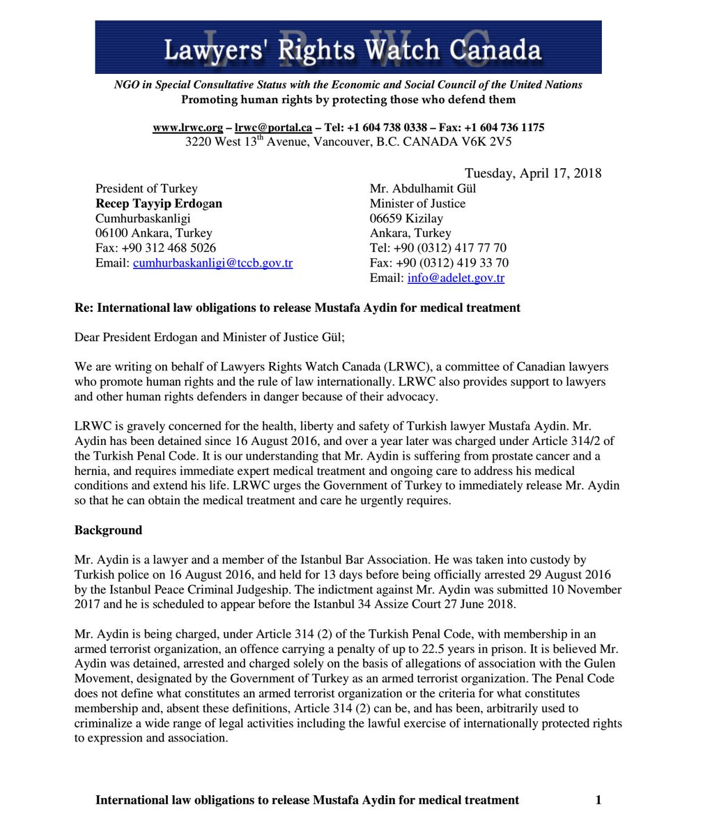 The @LRWCanada supports our urgent action campaign for terminally ill, arrested lawyer Mustafa Aydin. @LRWCanada addressed a letter to President Erdogan & Justice Minister Gul, urged them to release & provide sufficient medical care for Mr Aydin. pic.twitter.com/TR6r5jlYSU