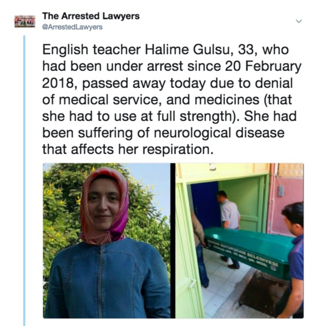 When Halime Gulsu & other 79 women were detained in Mersin, @IBAHRI @LRWCanada @LSHumanRights @L4L_INT @UnionIntAvocats @BarHumanRights denounced the mistreatment against them; one of those, Ms Gulsu passed away y'day due to denial of medical service, and medicines.pic.twitter.com/2L1ILGMU4N