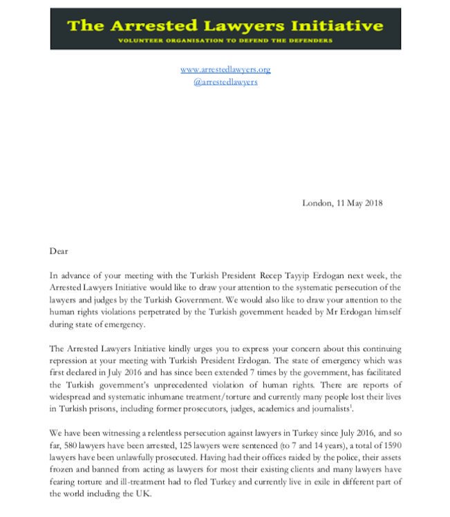 On the occasion of Erdogan's visit to London, The Arrested Lawyers Initiative addressed letters to Rt Hon PM @theresa_may, Rt Hon @jeremycorbyn, and Rt Hon @vincecable to draw attention to the systematic HRs violations and particularly persecution of lawyers by the Turkish Gov'tpic.twitter.com/hx515jYS1U