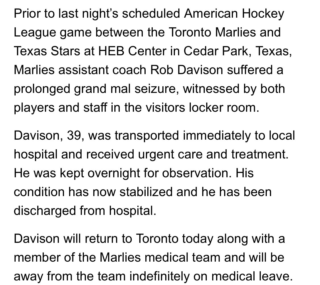 Per league source, the AHL was made aware of the medical incident, and the decision was made to delay the game by 30 minutes. At that time, the Marlies "declined to play" and thus forfeit the match officially. https://www.100degreehockey.com/2020/01/tonights-texas-stars-game-has-been.html …