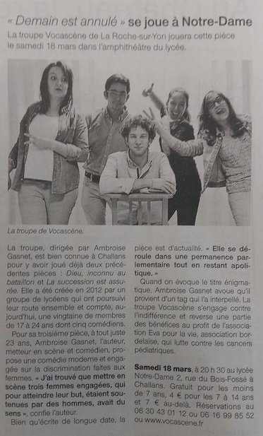 #Vocascene dans le Courrier#Vendéen pour "Demain est annulé, une "comédie politique", pléonasme ? RV le 18/03 à@VilledeChallanspic.twitter.com/kNyjlDyBoN