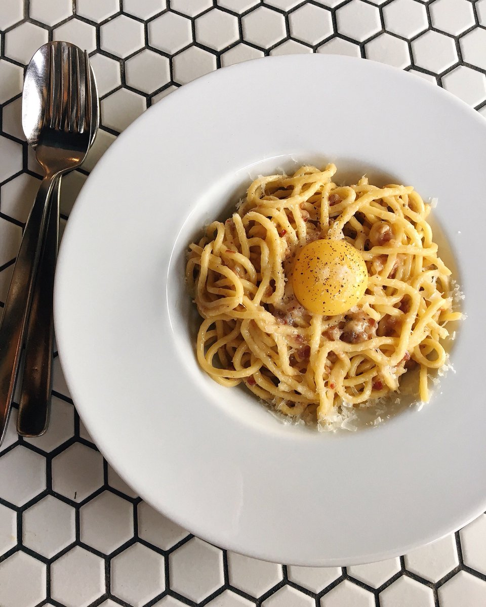 With pancetta, garlic, pecorino & egg yolk.