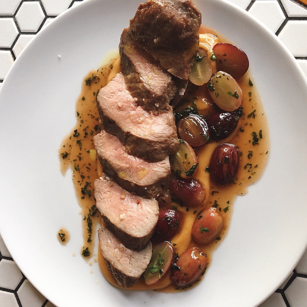 Braised duck breast with a rutabaga puree and grapes.