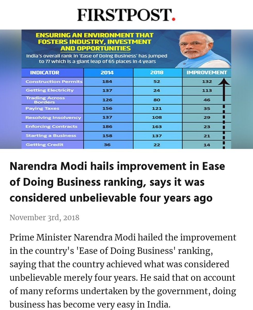 PM Shri @narendramodi hails improvement in #EaseOfDoingBusiness ranking, says it was considered unbelievable four years ago https://www.firstpost.com/business/narendra-modi-hails-improvement-in-ease-of-doing-business-ranking-says-it-was-considered-unbelievable-four-years-ago-5494371.html …pic.twitter.com/keae2B1vtn