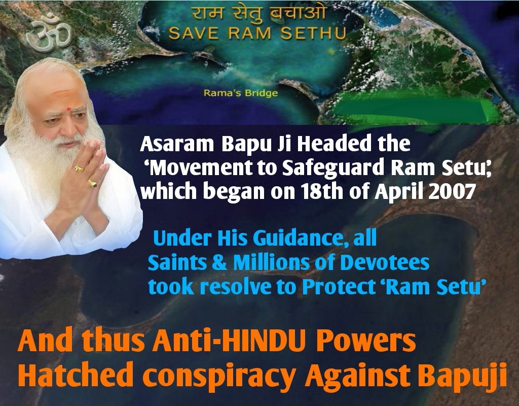 जब तत्कालीन कांग्रेस सरकार ने सुप्रीम कोर्ट मे हलफनामा दायर कर राम के अस्तित्व को नकार दिया और राम सेतु तोड़ने की कोशिश की तब Sant Asaram Bapu Ji ने इसका डटकर विरोध किया जिससे बौखलाकर उसने Asaram Bapu Ji को रेप केस मे फंसाया ।