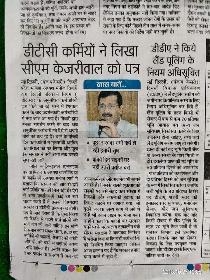 केजरीवाल जी शौक तो हम डीटीसी कॉन्ट्रैक्ट कर्मचारियों को लगा है 22 अक्टूबर से लगातार प्रदर्शन कर रहे हैं और एक आप हैं जो एक बार भी मिलने नहीं आए क्या हम आपके अपने कर्मचारी नहीं हैं क्या हमने आपके लिए प्रचार नहीं किया था क्या आपका फर्ज नहीं बनता समान काम समान वेतन लागू करा जाएpic.twitter.com/sITWTIN3dh