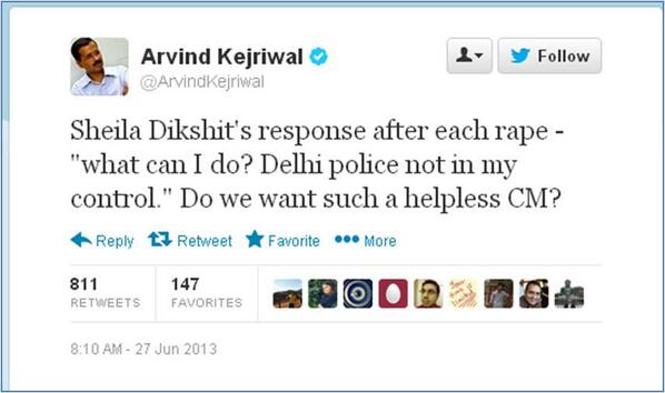 @ArvindKejriwal Going by the same logic, Sheila jee was not responsible for safety of women in Delhi. Right,sir? Easy to say anything. -