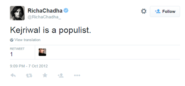 @ArvindKejriwal Hello populist!!!@RichaChadha_pic.twitter.com/LhRxhV2LdM