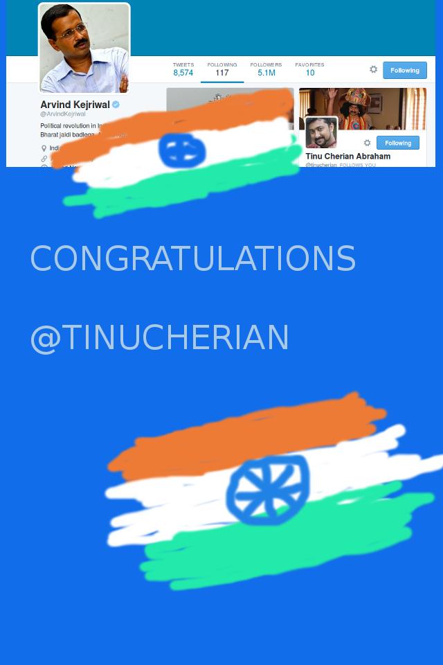 @tinucherian Its great to see that Dear@ArvindKejriwal Sir, the CM of Delhi is now following you!pic.twitter.com/C0rq8m2ayp
