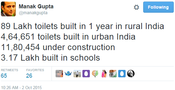 @ArvindKejriwal 1 year of SwachhBharat 80 Lakh new toilets built & Social Awareness..Now tell me AAP ne kya kiya? Rayta failane ke alwa!