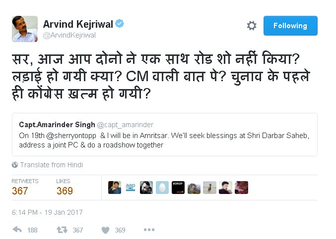 @ArvindKejriwal@capt_amarinder@sherryontopp Ha Ha, Sneaky little fellow baat sahi pakadta hai, haina Capt Saheb?? Thoko thoko!!Thanks. Twitter will use this to make your timeline better. UndoUndo