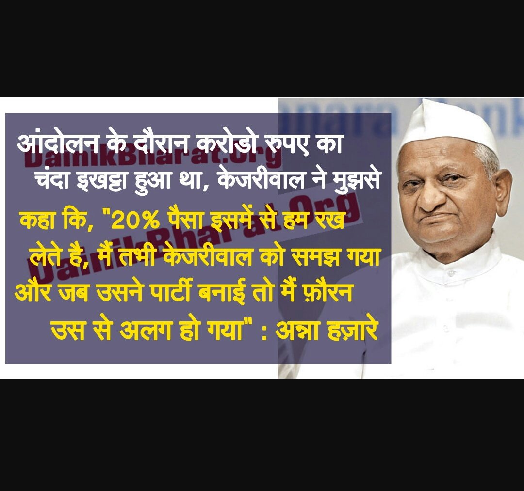 #आंदोलन के चंदे में से 20% अपने पास रख लेना चाहता था #केजरीवाल, मैं केजरीवाल को समझ गया और उस से अलग हो गया : #अन्ना हज़ारेpic.twitter.com/sTqh83cidu