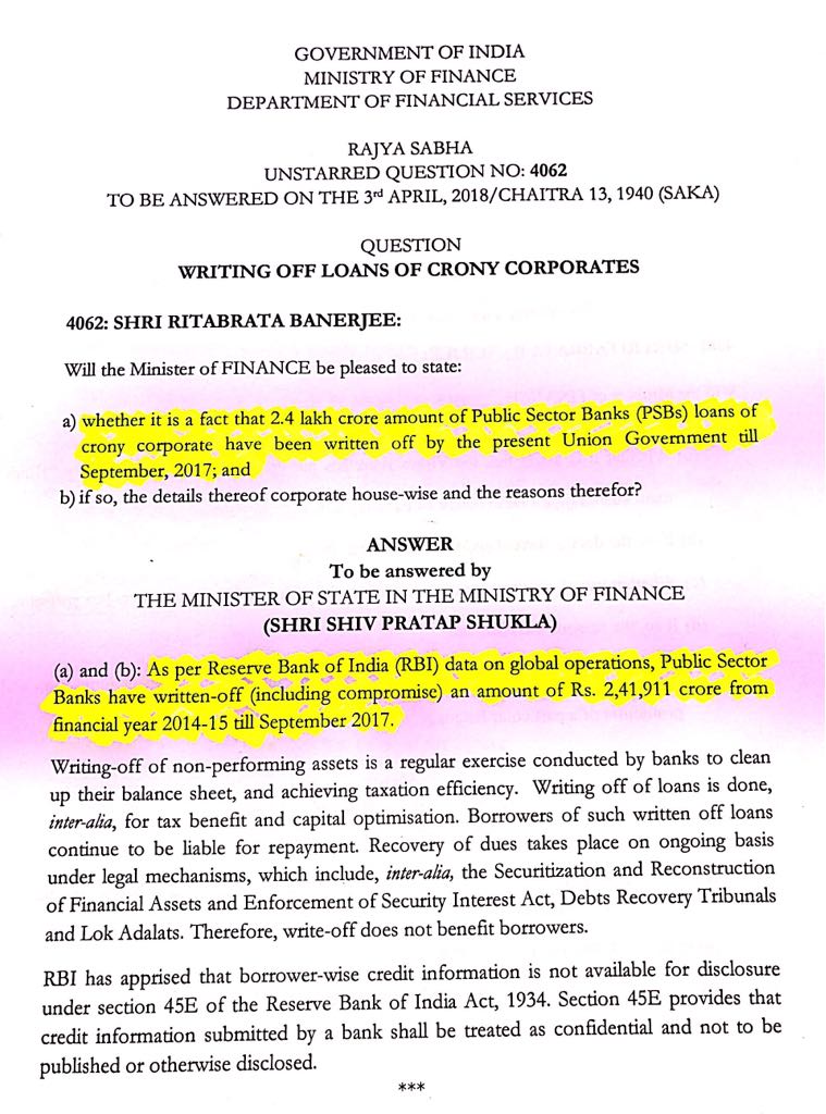 Big Story : Modi govt admits in the Parliament that it has "written off" the Corporate loan worth 2.4 lakh Cr of year 2014-2015 till September 2017, govt not revealing the names of those corporates saying it is confidential.pic.twitter.com/1SIyV1PHSC