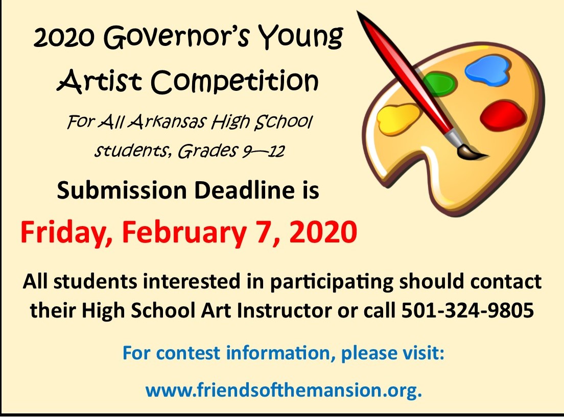 Arkansas high school students, the deadline to apply for the 2020 Governor’s Young Artist Competition is February 7! Learn about this year’s theme, “The Home Within,” and how to submit your artwork here: https://www.friendsofthemansion.org/ pic.twitter.com/xr3Lvk1nRQ