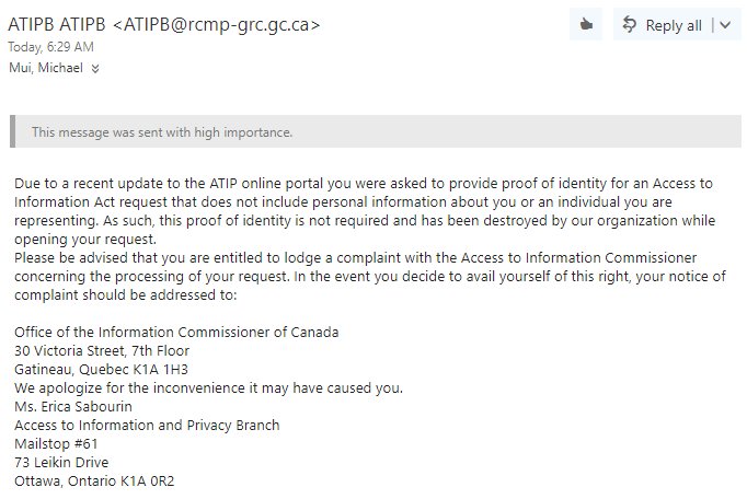 Except the RCMP's "coding error" remains in place on the ATIA Online Portal. So the Mounties promise to destroy the personal information they improperly collect, but continue to collect it.