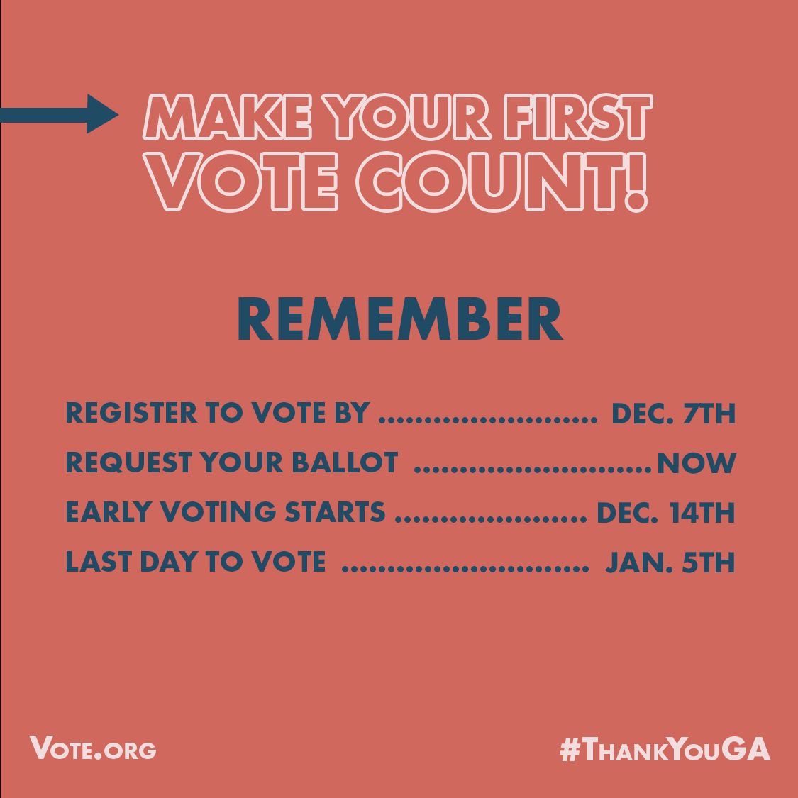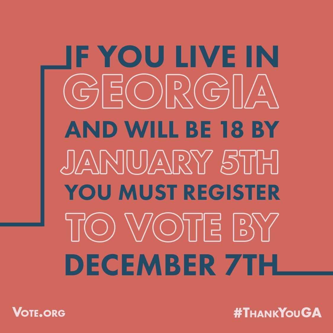 Georgia! Thank you so much for all that you are doing. Here are some important key dates and helpful details! Check your voter registration status. The deadline to register to vote is Dec. 7. If you turn 18 before Jan. 5, also register to vote. Early voting begins Dec. 14.pic.twitter.com/dOLaPCOZhM
