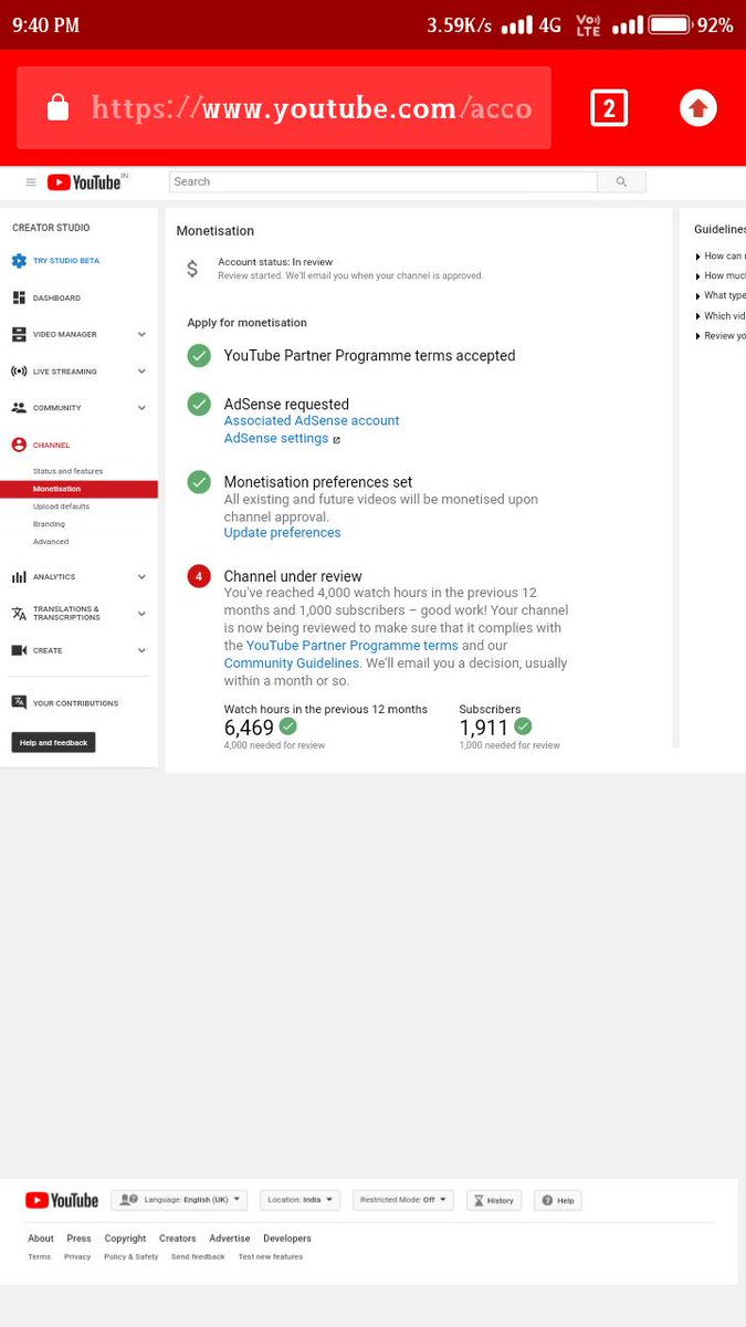 @TeamYouTube Dear YouTube team I have already completed 4k hours watch time and 1k Subscriber's in previous 365 days and my channel monitaization Re-enable please guide