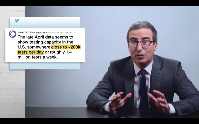 @iamjohnoliver reading a tweet from@COVID19Tracking on his show. It's a reminder that testing and tracking the data is still more important than ever. Props to@jdmaresco for finding this epic screen grab