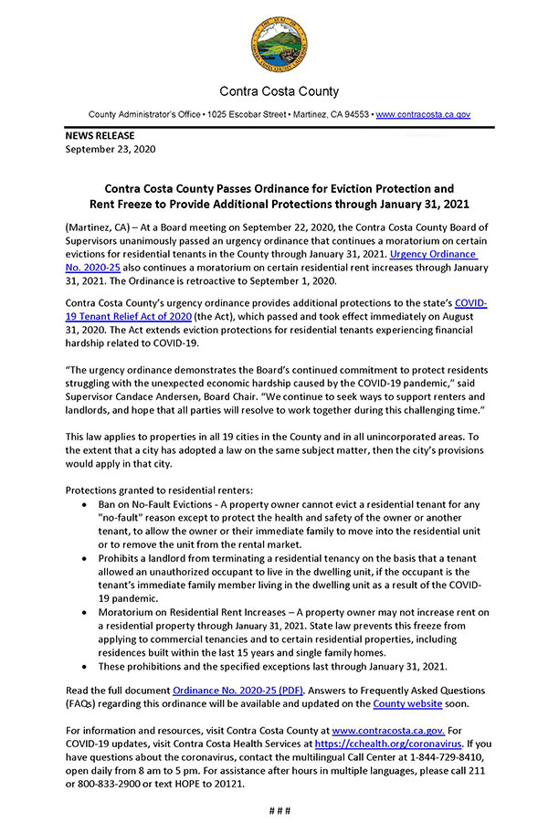 @CCCounty Board of Supervisors passed an Eviction Protection and Rent Freeze Ordinance to provide additional protections through January 31, 2021. See the news release, Ordinance, and resources at: http://www.contracosta.ca.gov/CivicAlerts.aspx?AID=2417 …pic.twitter.com/xwg02naK0C