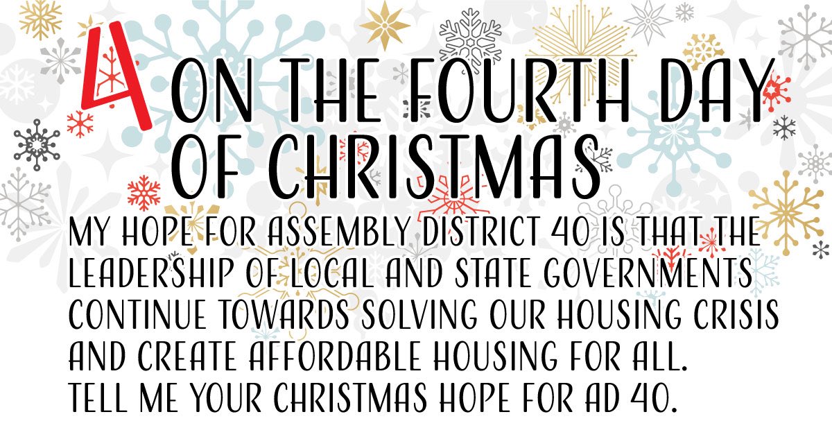 For the twelve days of Christmas, I will be sharing my hopes for the 40th Assembly District in the coming year. However you celebrate this holiday season, I hope you’ll find the time to share your hopes for our community with me.pic.twitter.com/yrmNGulukY