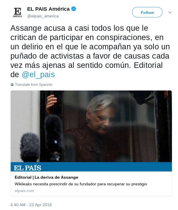 This is shameful: El Pais takes revenge for independent report to UK Parliamentary 'Fake News' Committee that exposed its deputy editor Alandete seriously misrepresenting the truth to the Committee. The revenge? Publishing an attack editorial against Assange, who's in isolation.pic.twitter.com/4Ygt9qTknv