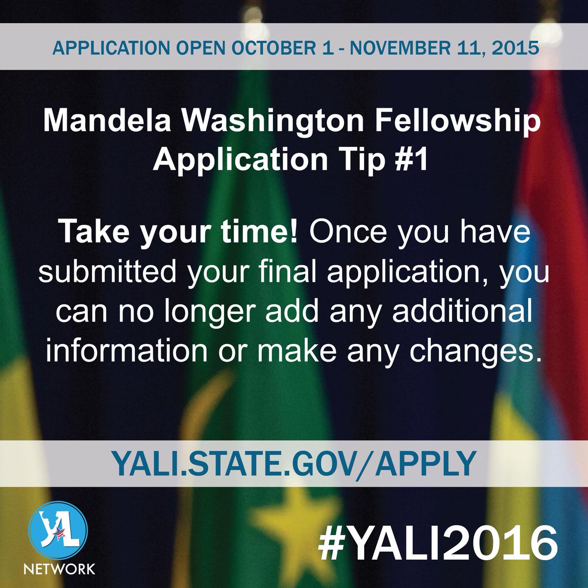 Mandela Washington Fellowship Application Tip #1. TAKE YOUR TIME! @WashFellowship #yali2016 pic.twitter.com/vJVt80RFmS