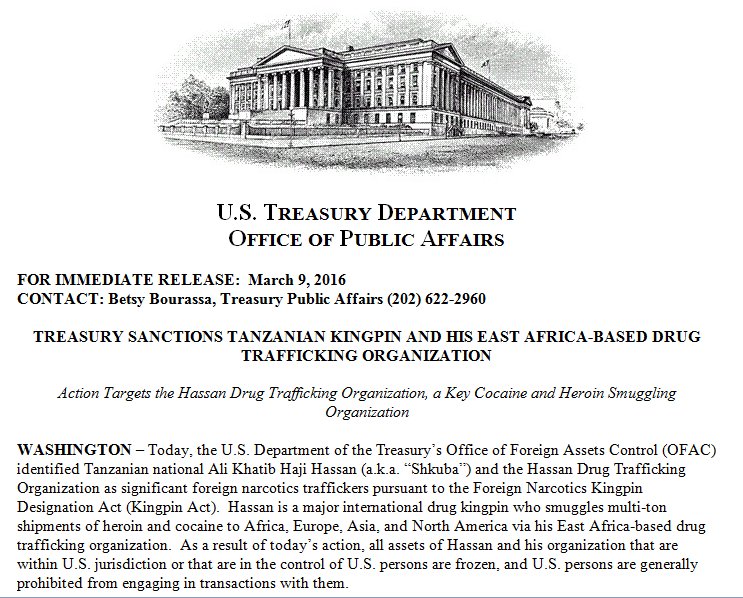 US sanctions Tanzanian & an East Africa-based drug trafficking organization.https://twitter.com/USTreasury/status/707593555984781312 …