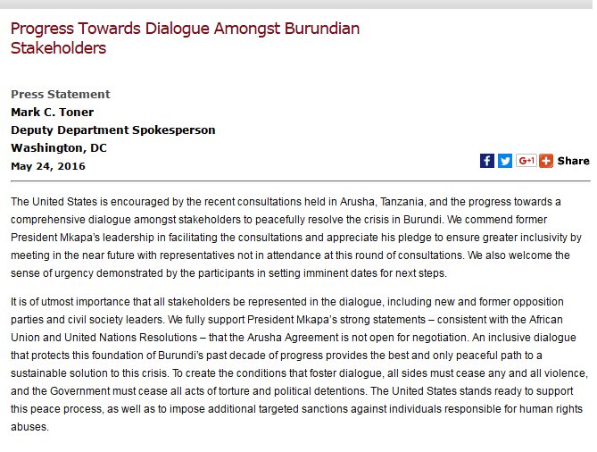 U.S. is encouraged by progress towards comprehensive dialogue amongst stakeholders to resolve #Burundi crisis.pic.twitter.com/jXkX8NeCC4