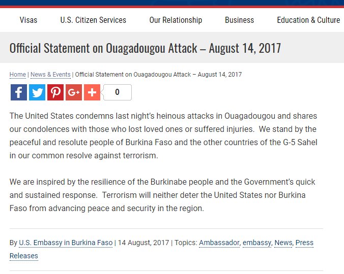 1/2) The United States condemns the attack in #Ouagadougou and we share our condolences for lives lost→http://goo.gl/NMosGq pic.twitter.com/LQuWdql1wA