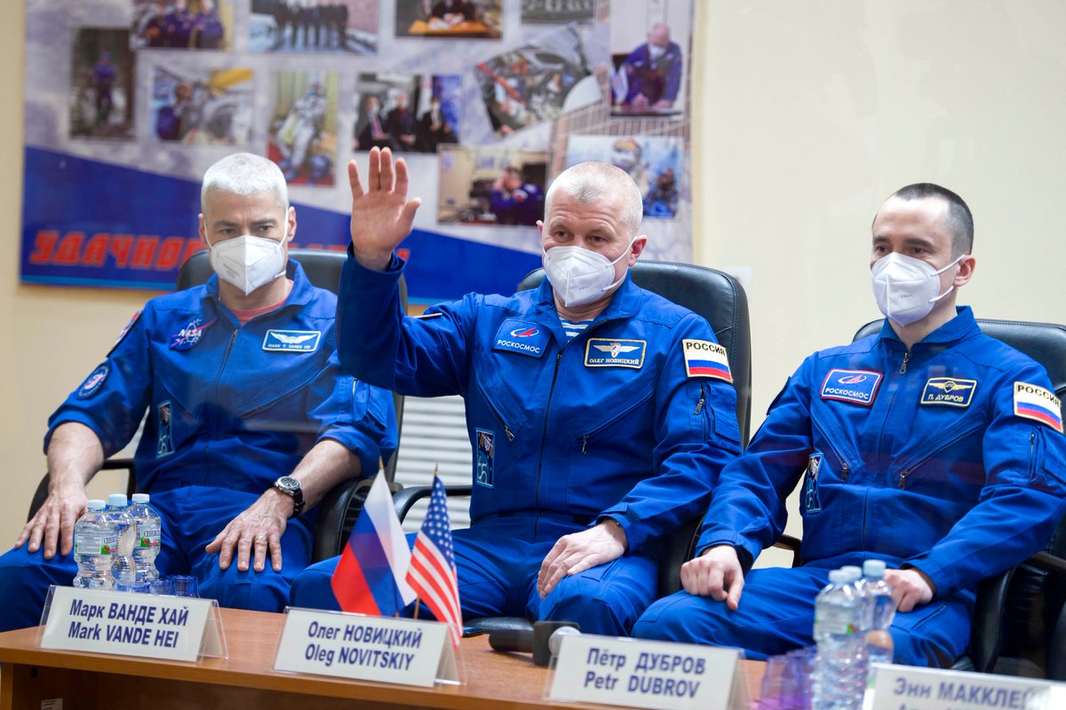 @NASA_Astronauts@Astro_Sabot, and@Roscosmos cosmonauts@novitskiy_iss, and Pyotr Dubrov participate in the State Commission and Press Conference in advance of their launch to@Space_Station April 9th.