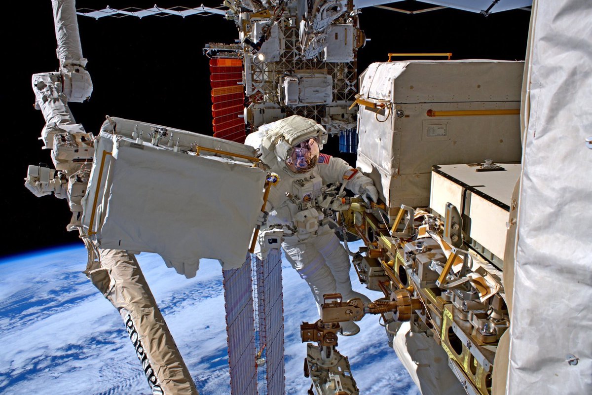 @astro_luca and I completed 3 spacewalks to repair the AMS on@Space_Station. In the first photo I’m holding the pump module we installed to restore it’s cooling system. Tomorrow we go out for 4th time & finish the job! Tune in: http://NASA.gov/live pic.twitter.com/aWL68IX6Oo