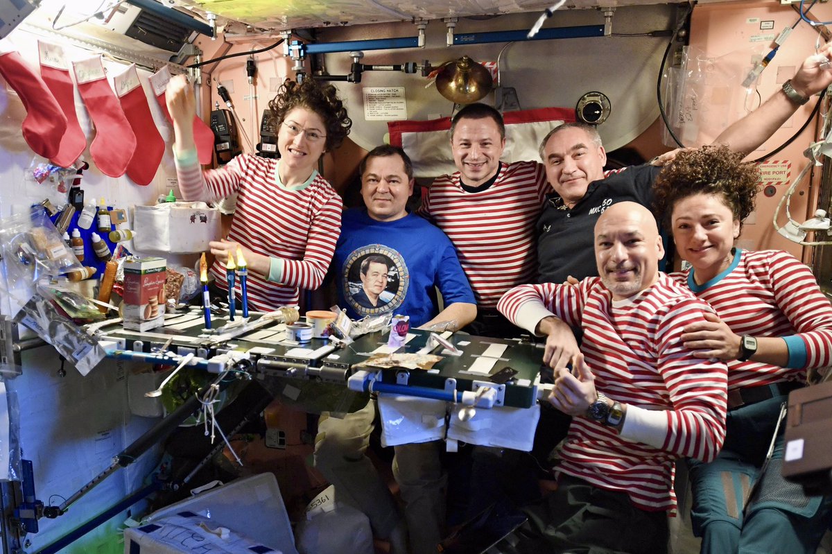 @Space_Station: an international celebration with an international crew! We exchanged gifts in stockings and shared seasonal foods packaged for space from the US, Italy and Russia… even included smoked salmon!pic.twitter.com/qFlpizDf26