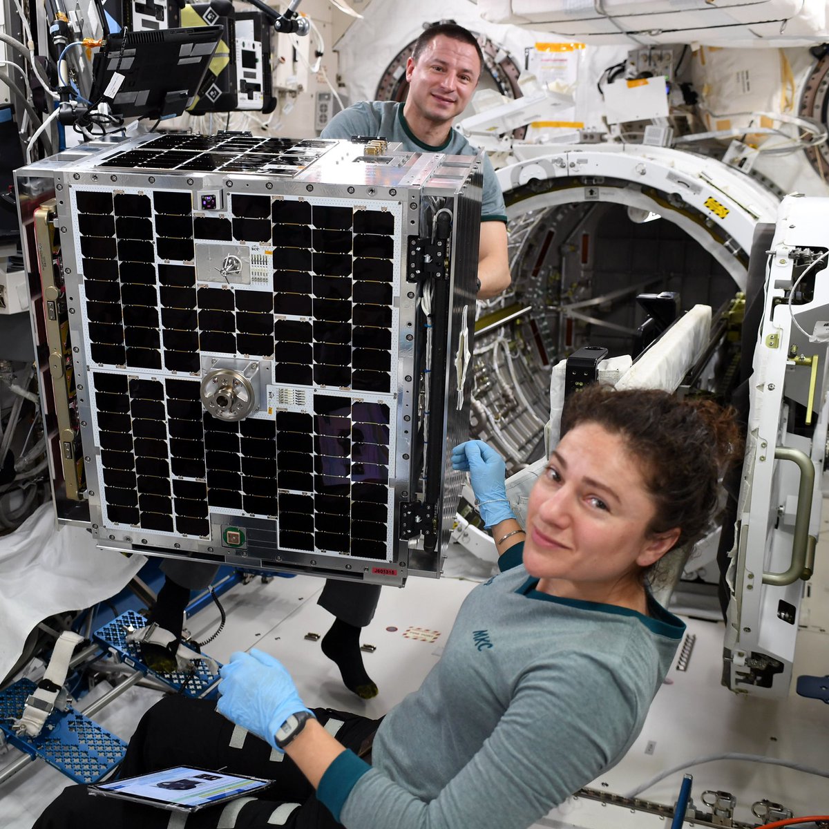 @AstroDrewMorgan and I prepped STPSat-4. This satellite includes space weather sensors and devices for tracking satellites and their astronomic surroundings. Via the@JAXA_en airlock (behind Drew), the satellite was put into orbit from the external platform today!pic.twitter.com/1bXO8adF2D