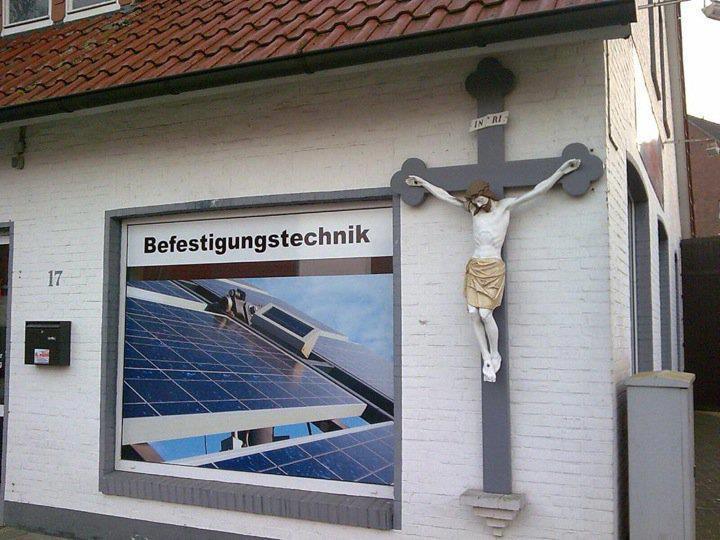 #BiBesch: Neben einem Schaufenster mit dem Schriftzug „Befestigungstechnik“ ist an einer Hauswand ein großes Kreuz mit einem daranhängenden Jesus angebracht.https://twitter.com/JJChabernaque/status/1514840441295826946 …