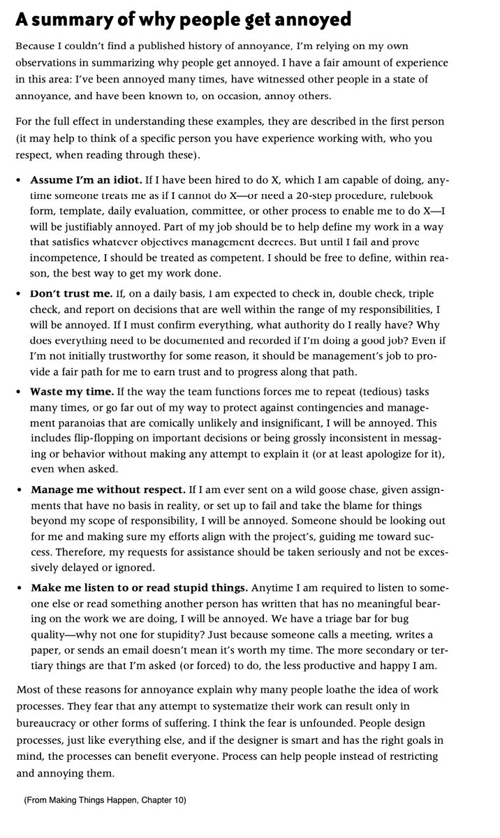 Good managers and leaders minimize how annoying they are to follow. They can be demanding, but not demeaning. Effective, but w/ respect. Here's my list of top annoyances from Making Things Happen, chp. 10: How Not To Annoy People (yes that's the actual chapter title)pic.twitter.com/TjuKoTnOnV