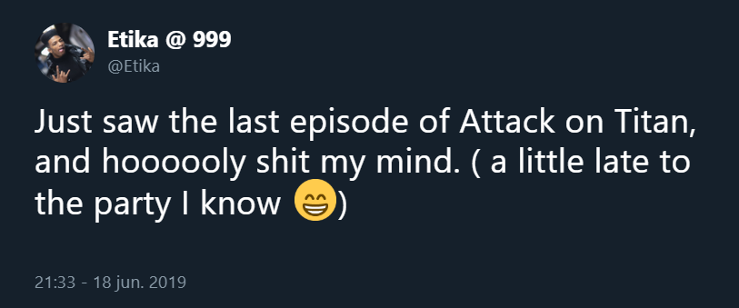 https://twitter.com/ShingekiKyojin/status/1144274862833201153?s=19 …Спасибо. Твиттер использует эту информацию, чтобы сделать вашу ленту лучше. ОтменитьОтменить -