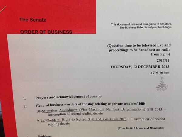 The #Senate meets today at 9.30. You'll find today's festive end-of-year Red (the agenda) here http://bit.ly/J7sLqb