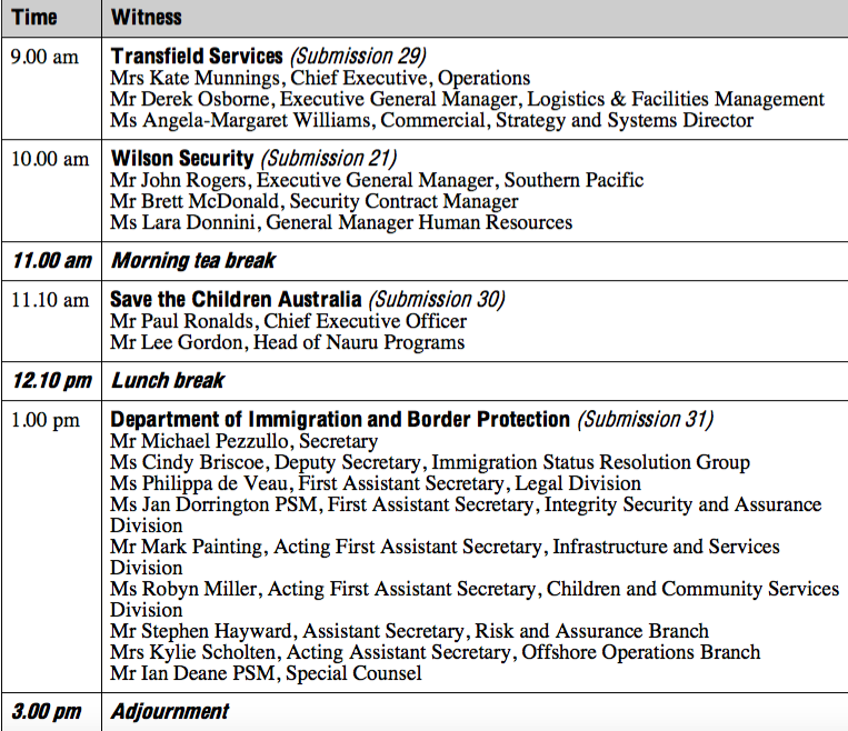 Program for #NauruInquiry. @TransServices first up.pic.twitter.com/7S2Cv1vrmZ