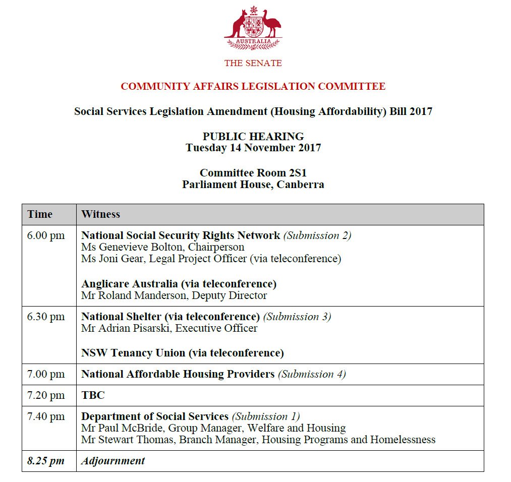 The Community Affairs Legislation Committee is holding a public hearing into the Social Services Legislation Amendment (Housing Affordability) Bill 2017 in Canberra this evening Live: http://bit.ly/LiveParl pic.twitter.com/LGMuYCHETf