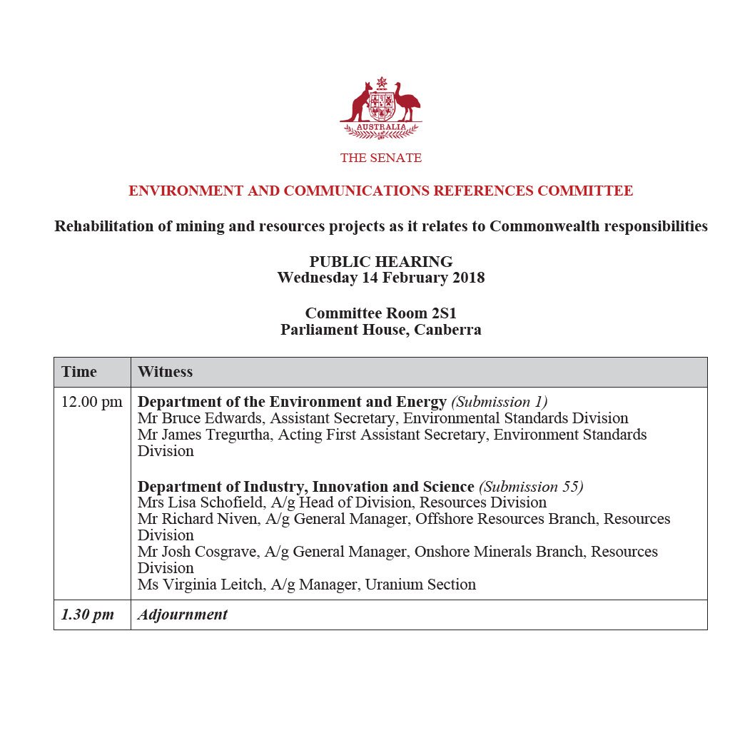 The Environment and Communications References Committee is holding a public hearing today into the rehabilitation of mining and resources projects as it relates to Commonwealth responsibilities Live: http://bit.ly/LiveParl pic.twitter.com/VX9In6lyjl