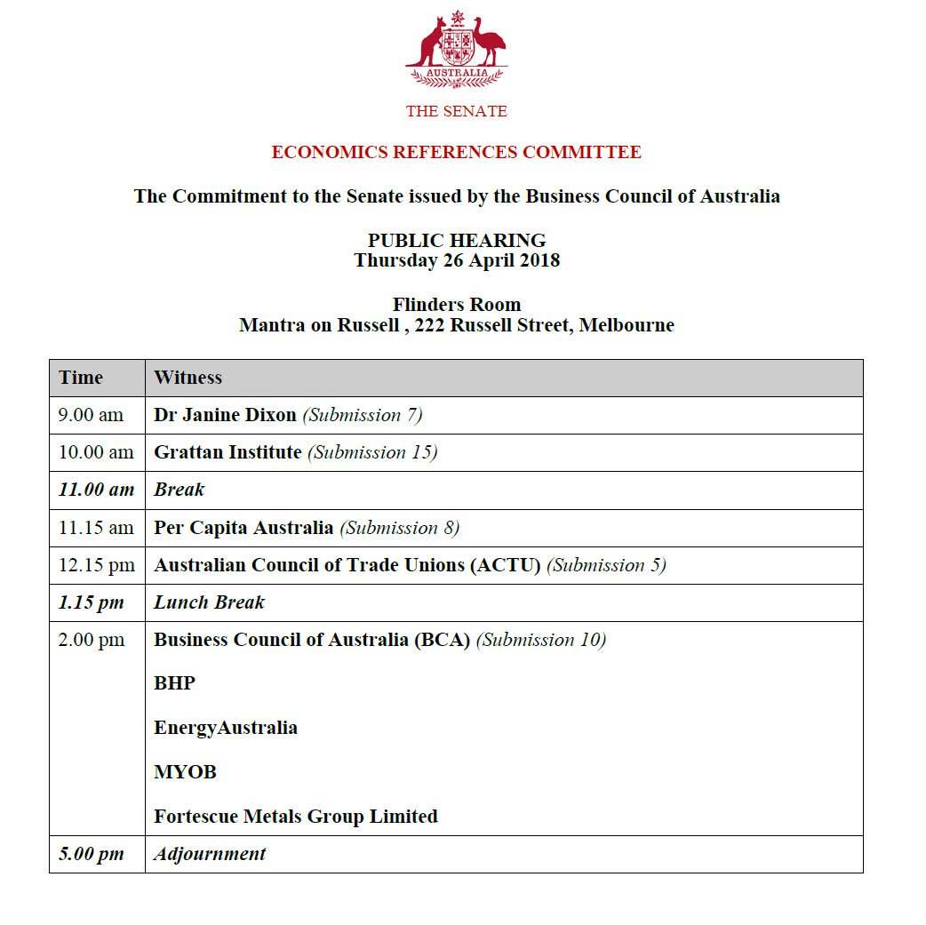 The Economics References Committee is in Melbourne today for its inquiry into the commitment to the Senate issued by the Business Council of Australia Live: http://bit.ly/LiveParl pic.twitter.com/h8TAEZFopQ