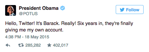 [BLOG] @POTUS joined Twitter this week, and gained 1 million followers in just 5 hours http://bit.ly/1doTwpS pic.twitter.com/YiK79LW9X6