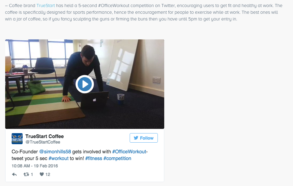 The #OFFICEWORKOUT word is spreading- thanks for the write-up @SocialBro! There's still time to enter a 5 sec clip!pic.twitter.com/ixRsDkYueX