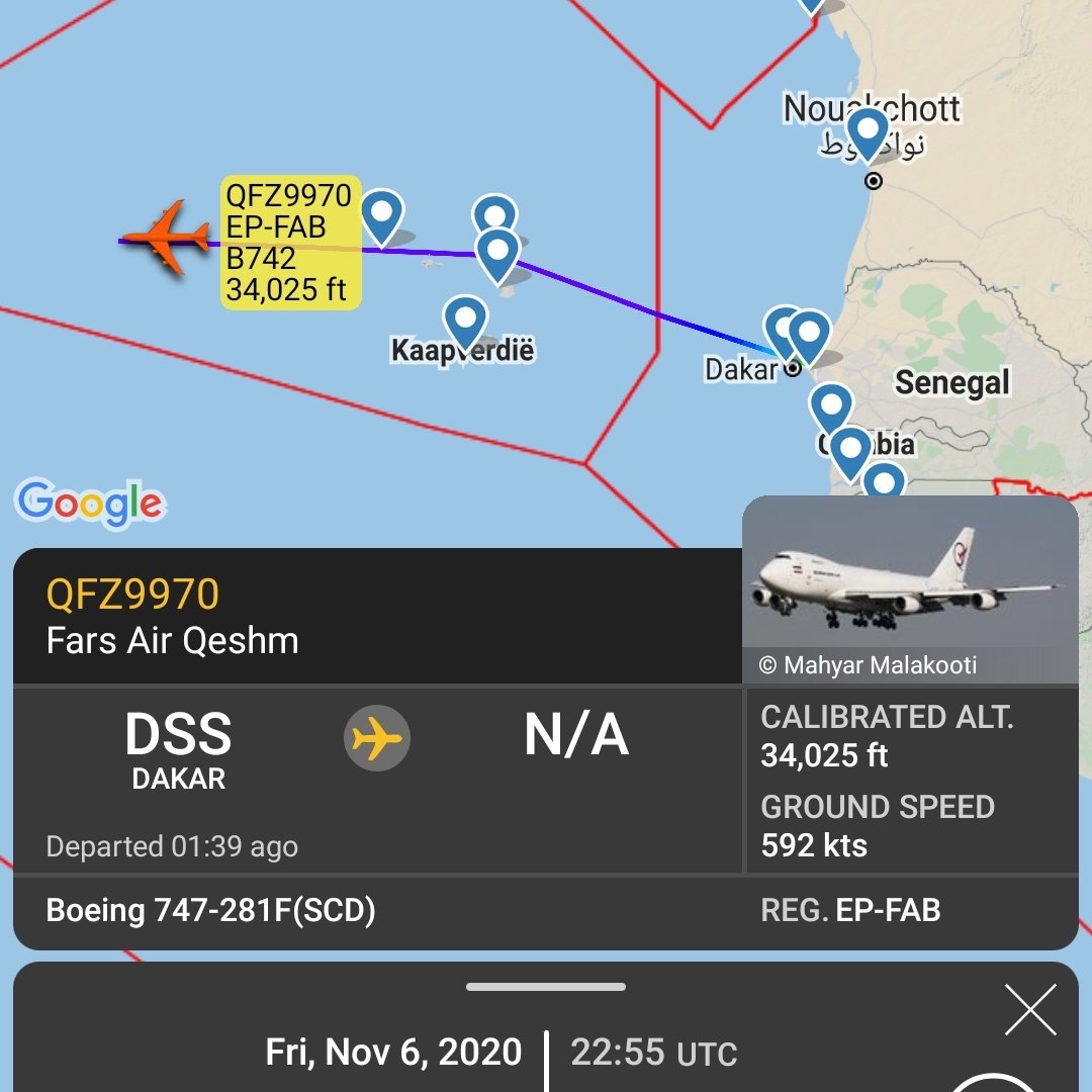 #IRGC Affilated Qeshm Fars Air EP-FAB is still tarmac’d after what appears to be disallowed landing privledges in Cape Verde. She landed in Dakar,#Senegal. Is the additional 390 miles maybe too much for her with the current cargo? (1/2)pic.twitter.com/pYj2MPIsth