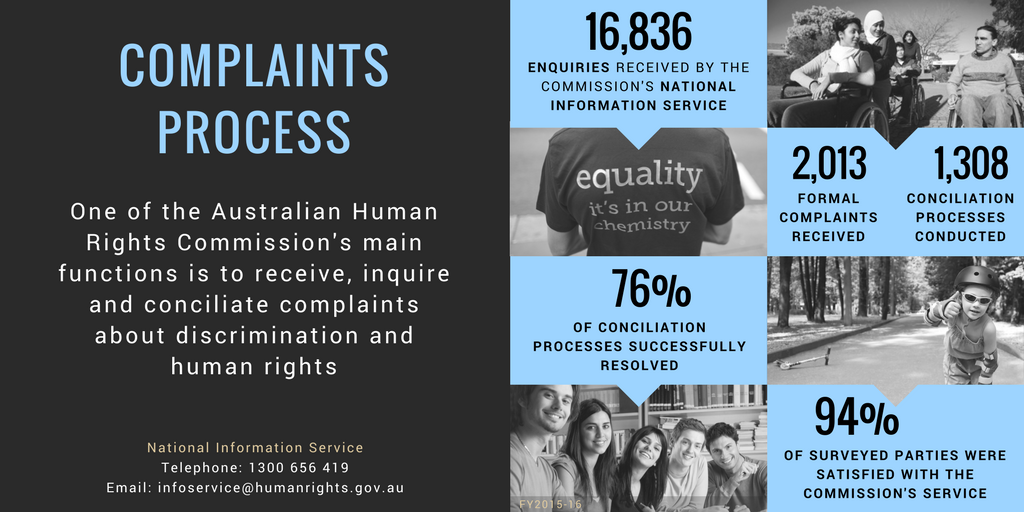 The Commission's complaint process allows people to voice their concerns about discrimination. More info http://www.humanrights.gov.au/complaint-information … #AusLawpic.twitter.com/UbQJaEV19V