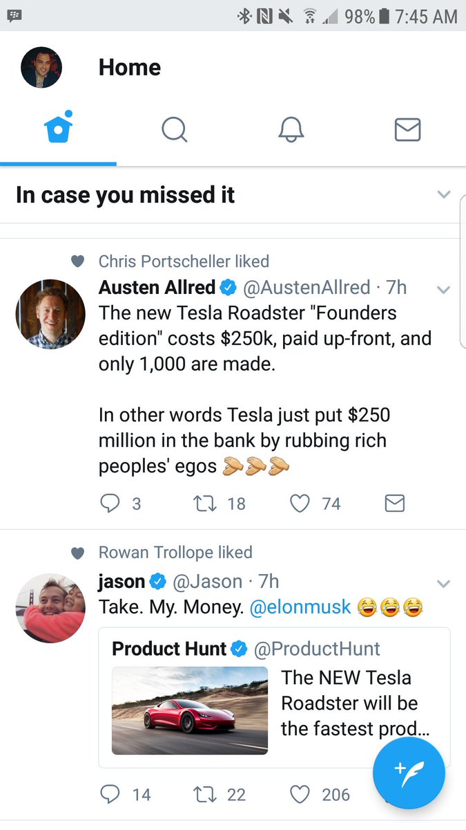 "Throw in a video about the new roadster at the end, we'll add about a quarter billion to the bank account"